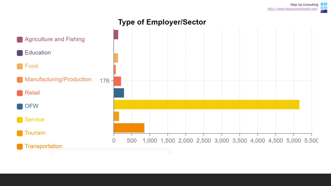 As earlier reported in the case of businesses, the service sector is the worst hit, even for employees or workers. Across Tagbilaran City’s 15 barangays, those working in the service sector are the ones most affected by the pandemic. 5,154 jobs is equivalent to 73% of total jobs lost when Enhanced Community Quarantine was imposed in the city.