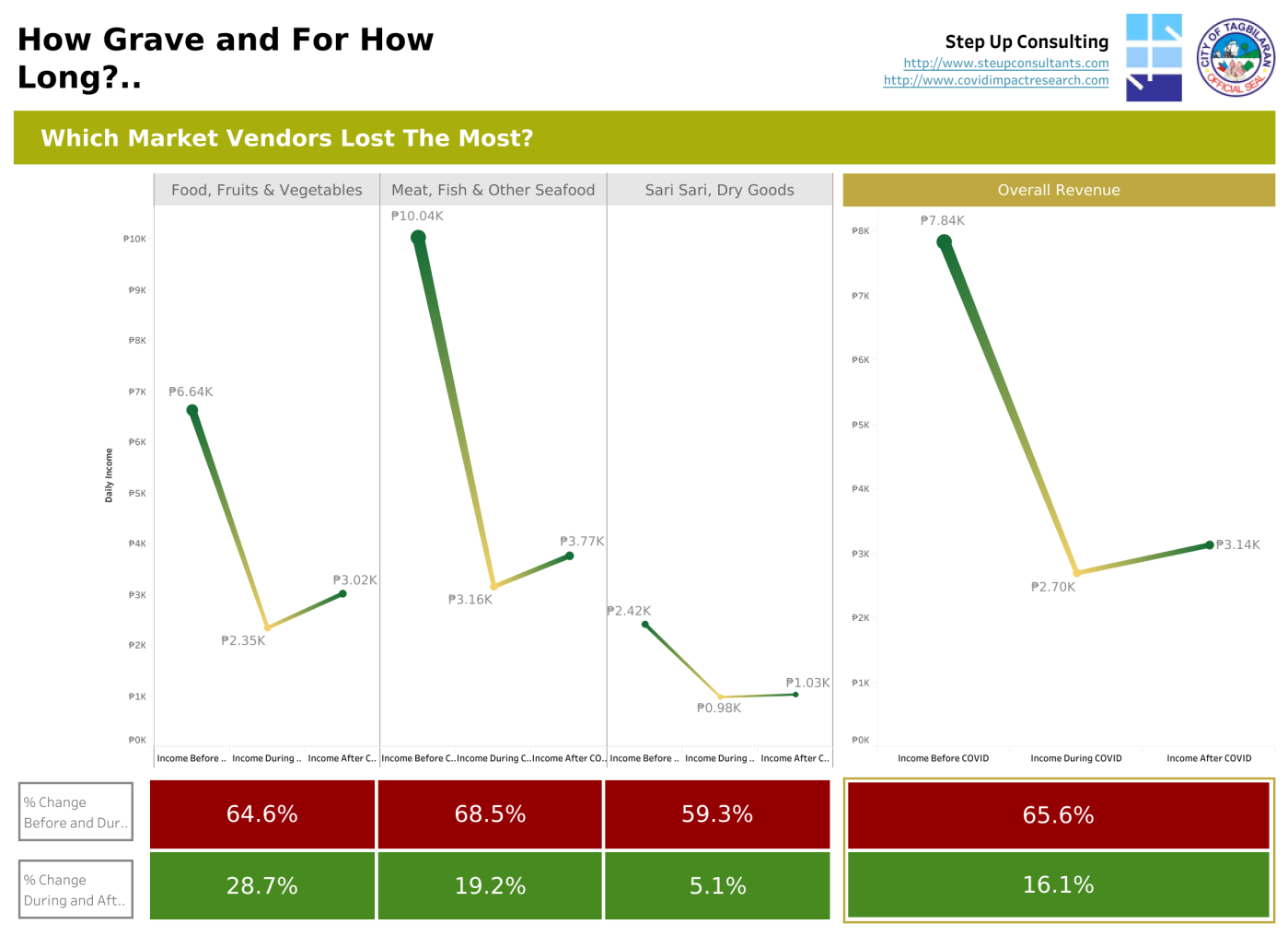Market vendors in Tagbilaran’s key markets (e.g. Dao, Cogon, and Manga) experienced an overall decline in sales. Meat, fish, and seafood vendors experienced the sharpest decline as consumers switched to cheaper alternatives.